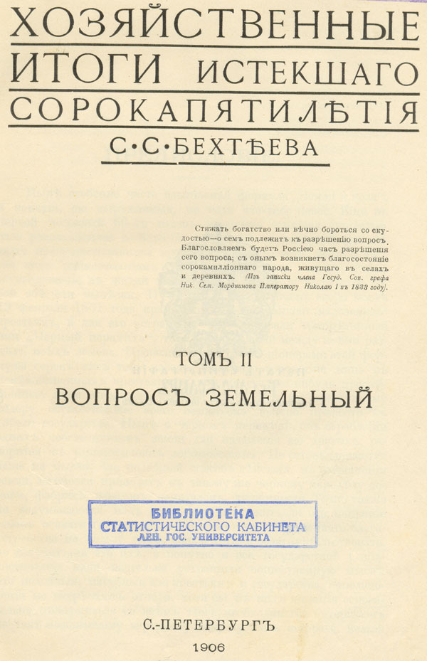 Хозяйственные итоги истекшаго сорокапятилетія. Т. 2 : Вопрос земельный / С. С. Бехтеев. - С.-Петербург, 1906 ( : Типографiя Т-ва М. О. Вольф). - V, 349 с., [16] вкл. л. табл.