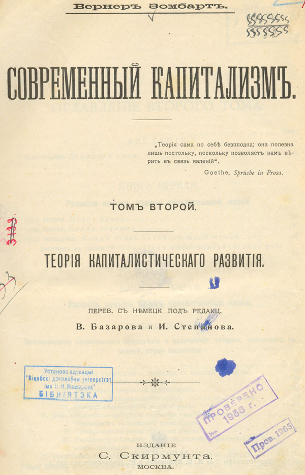 Современный капитализм. Т. 2 : Теорiя капиталистическаго развитiя / В. Зомбарт ; перевод с немецкаго под редакц. В. Базарова и И. Степанова. - Москва : Изданiе С. Скирмунта, [190-?]. - XVI, 485 с. - Библиогр. в обл. ссылок. - Экз. деф.: нет с. 1-16.