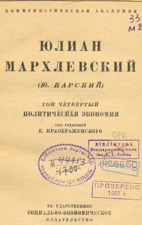 Сочинения. Т. 4 : Политическая экономия / Ю. Карский ; под ред. Е. Преображенского ; Коммунистическая академия. - Москва ; Ленинград : Гос. соц.-эконом. изд-во, 1931. - 440 с., портр., [1] вкл. л. - Библиогр. в обл. ссылок.