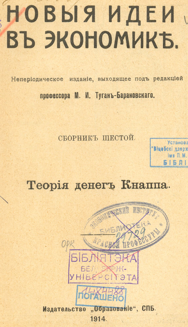 Новыя идеи в экономике. Сб. 6 : Теорiя денег Кнаппа / неперiодическое изданiе, выходящее под редакцiей ...М. И. Туган-Барановскаго. - СПБ. : Издательство "Образованiе", 1914. - 142 с. - Библиогр. в обл. ссылок. - Экслибрис книгоиздательства "Образованiе".