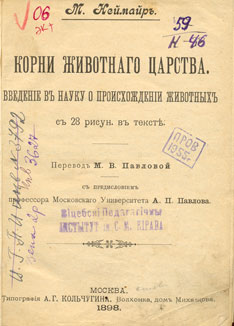 Корни животнаго царства. Введенiе в науку о происхожденiи животных / перевод М.В. Павловой ; с предисловiем ... А.П. Павлова. - Москва: Типографiя А.Г. Кольчугина, 1898. - 231 с.: ил. - Библиогр. в обл. ссылок. - Экз. деф.: нет с. 11-16 .