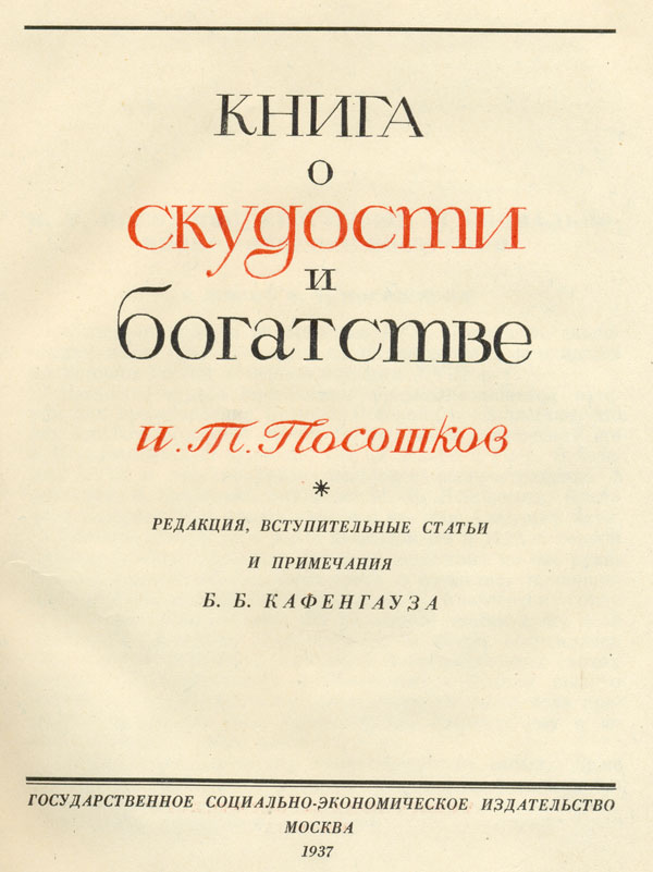 Книга о скудости и богатстве / И. Т. Посошков ; ред., вступ. ст. и примеч. Б. Б. Кафенгауза. - Москва : Соцэкгиз, 1937 (Москва : Типография им. Воровского, 1937). - 351 с. - Библиогр. в обл. ссылок и примеч. - Словарь: с. 348-351.
