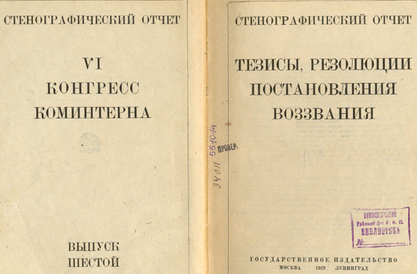 VI конгресс Коминтерна : стенографический отчет. Вып. 6 : Тезисы, резолюции, постановления, воззвания. - Москва ; Ленинград : Госиздат, 1929. - 199 с. Сигла хранения: фрк Оглавление