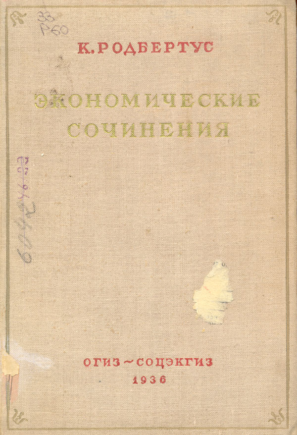 Экономические сочинения / К. Родбертус ; пер. и предисл. И. Плотникова. - Ленинград : ОГИЗ, Соцэкгиз. Ленингр. отд-ние, 1936. - 435 с. - (Библиотека истории экономической мысли).