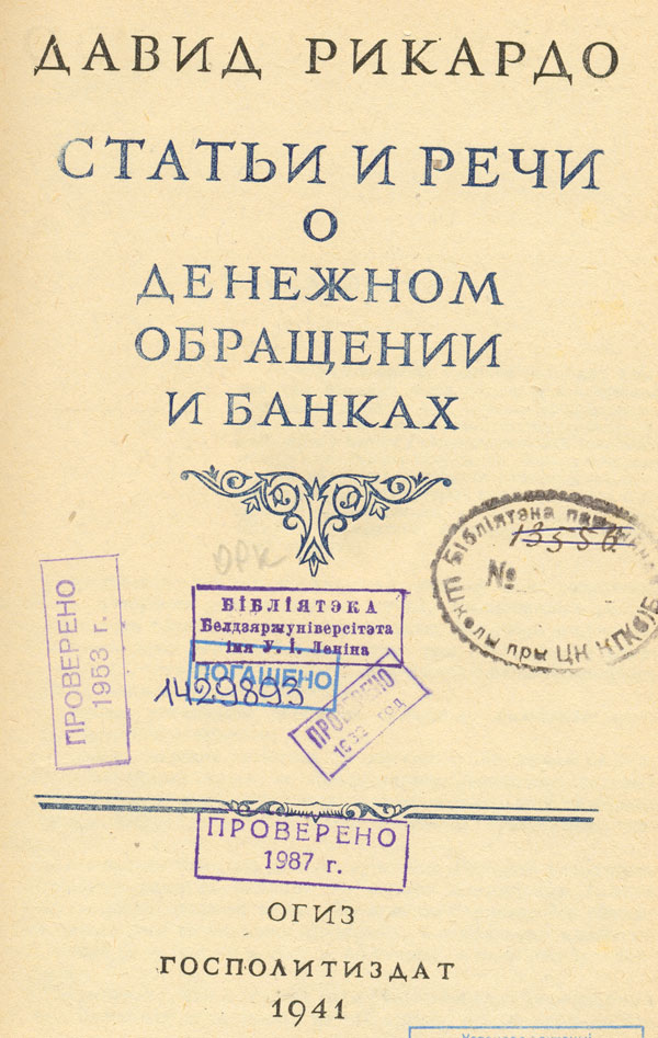 Статьи и речи о денежном обращении и банках / Д. Рикардо. - Москва : Огиз, Госполитиздат, 1941. - XIV, 351 с. - Библиогр. в обл. ссылок. - Загл. переплета: Сочинения. Том 2.