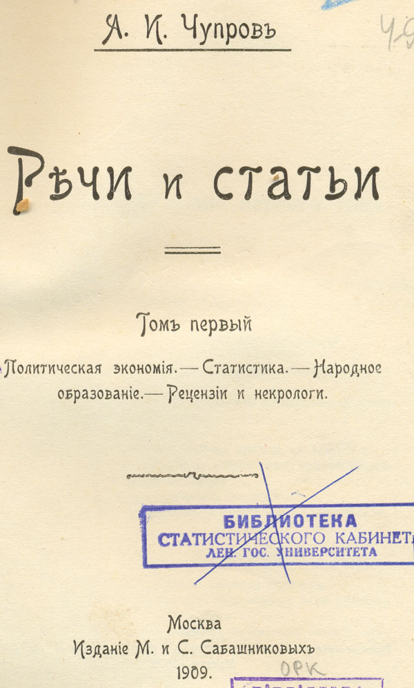 Речи и статьи. Т. 1 : Политическая экономiя. Статистика. Народное образованіе. Рецензiи и некрологи / А. И. Чупров. - Москва : Изданiе М. и С. Сабашниковых, 1909. - XLVIII, 548 с., портр. - Библиогр. в обл. ссылок.