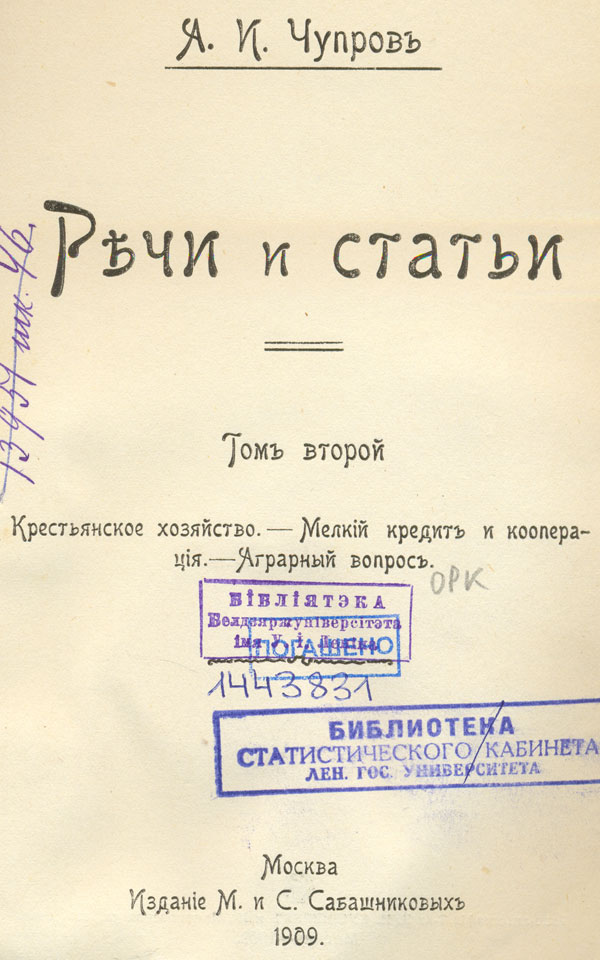 Речи и статьи. Т. 2 : Крестьянское хозяйство. Мелкiй кредит и кооперацiя. Аграрный вопрос / А. И. Чупров. - Москва : Изданiе М. и С. Сабашниковых, 1909. - 609 с., портр. - Библиогр. на с. 272 и в обл. ссылок.