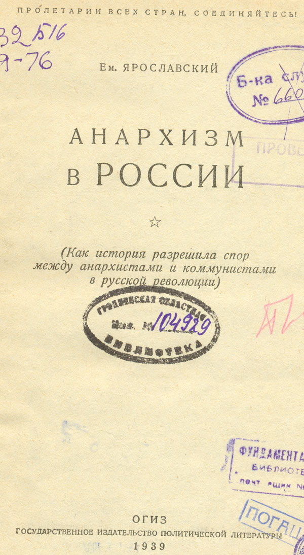 Анархизм в России (Как история разрешила спор между анархистами и коммунистами в русской революции) / Ярославский Ем. - Москва : Госполитиздат, 1939. - 119 с. - Библиогр. в обл. ссылок.