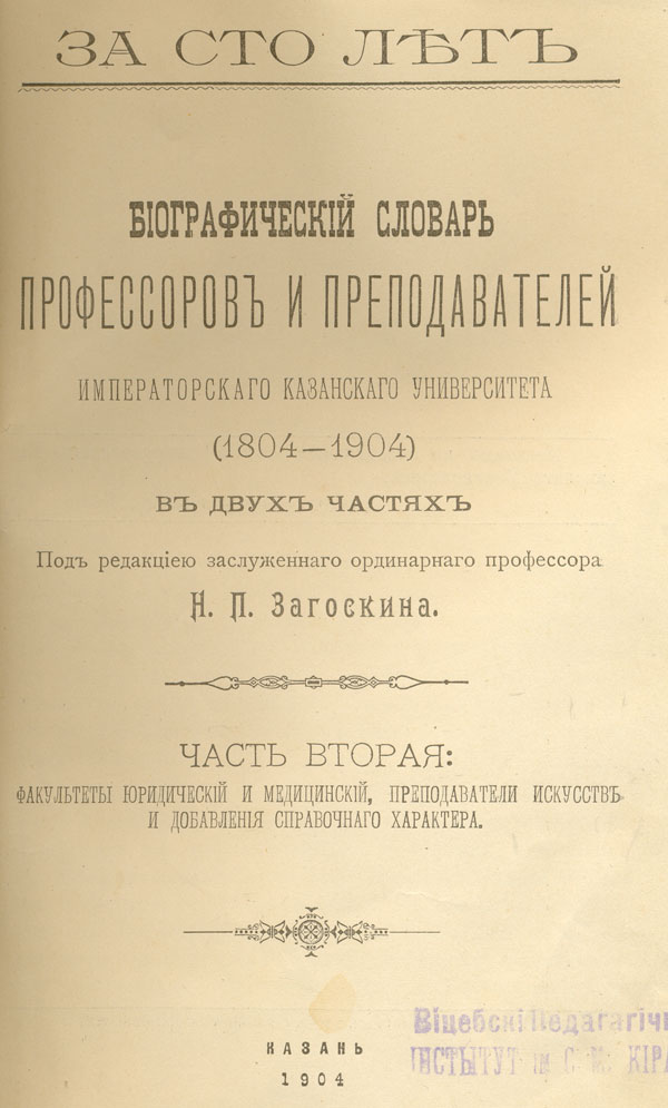 За сто лет : бiографическiй словарь профессоров и преподавателей Императорскаго Казанскаго университета (1804-1904) : в двух частях. Ч. 2 : Факультеты юридическiй и медицинскiй, преподаватели искусств и добавленiя справочнаго характера / под редакцiею Н. П. Загоскина. - Казань , 1904 ( : [Типо-литографiя Императорскаго Университета]). - 455 с. - Библиогр. в конце статей. - Алф. указ.: с. 435-453.