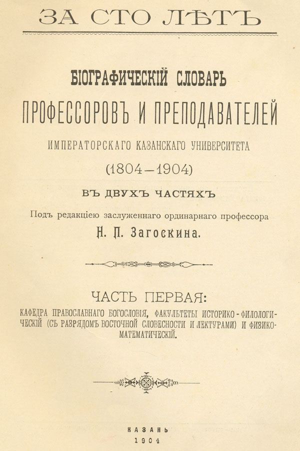 За сто лет : бiографический словарь профессоров и преподавателей Императорскаго Казанскаго Университета (1804-1904) : в двух частях. Ч. 1 : Кафедра православнаго богословiя, факультеты историко-филологическiй (с разрядом восточной словесности и лектурами) и физико-математическiй / под редакцiею ...Н. П. Загоскина. - Казань , 1904 ( : [Типо-литографiя Императорскаго Казанскаго Университета]). - XIV, 553 с. - Библиогр. в тексте.