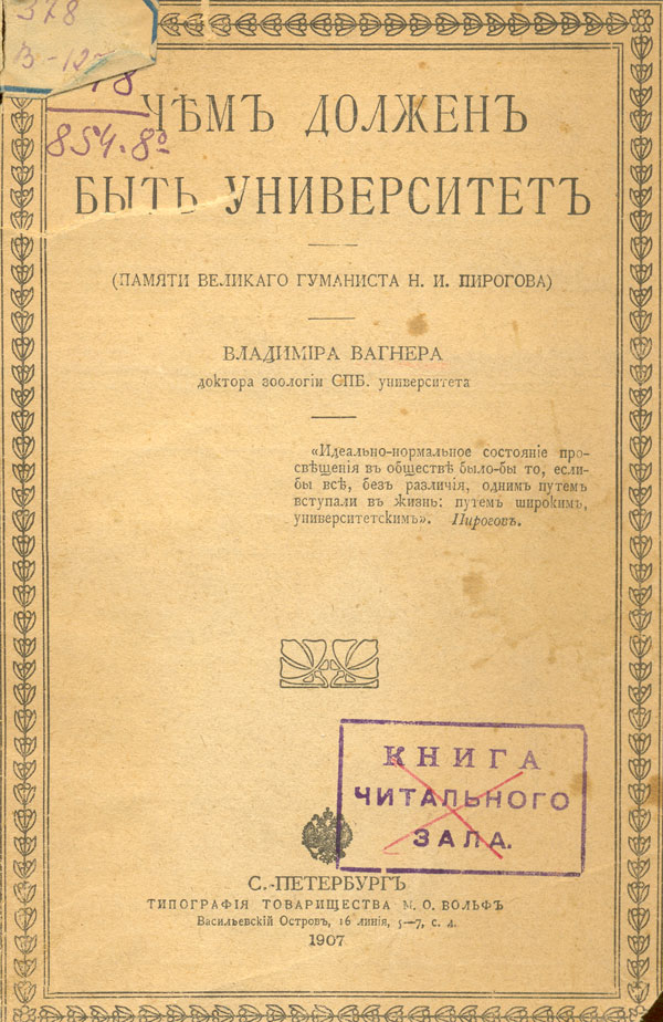 Чем должен быть университет (памяти великаго гуманиста Н. И. Пирогова) / В. Вагнер. - С.-Петербург, 1907 ( : Типографія Товарищества М. О. Вольф). - 50 с. - Библиогр. в обл. ссылок.
