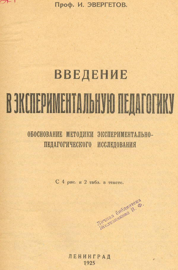 Введение в экспериментальную педагогику. Обоснование методики экспериментально-педагогического исследования / И. В. Эвергетов, В. А. Лай, Г. Ришар. - 617 c. разд. паг. - Изд. конволют без общ. тит. л., состоящий из трех отдельно изданных книг. - Содерж.: Введение в экспериментальную педагогиику. Обоснование методики экспериментально-педагогического исследования. / И. В. Эвергетов. - Ленинград : 1-я Тип. Транспечати им. Воровского, 1925. - 116 с. : ил. - Библиогр. в обл. ссылок ; Экспериментальная педагогика. / В. А. Лай ; пер. Е. И. Воскресенской ; под ред. В. Е. Игнатьева. - 2-е изд., просмотр. и доп. - Москва : Типографiя И. Д. Сытина, 1912. - 235 с. - (Вопросы педагогической психологии ; вып. 2) ; Экспериментальная педагогика. / Г. Ришар ; пер. с фр. Т. Хитрово ; под ред. Л. Д. Синицкаго. - Москва : Изданiе М. и С. Сабашниковых, 1913. - 266 с. - Библиогр.: с. 257-266 и в обл. ссылок.