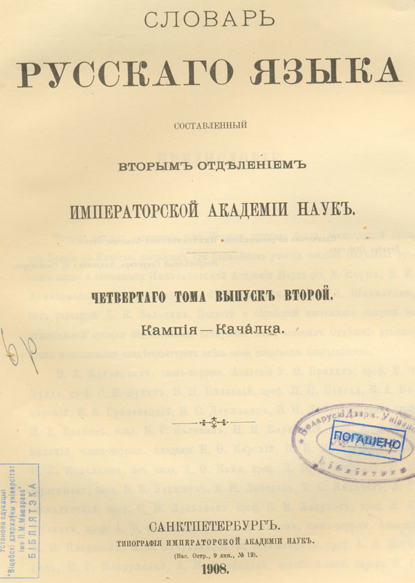 Словарь русскаго языка, составленный Вторым Отделенiем Императорской Академiи Наук.Т. 4, вып. 2 : Кампiя - Качалка. - Санктпетербург, 1908 ( : Типографiя Императорской Академiи Наук). - VIII с., Стб. 321-640.