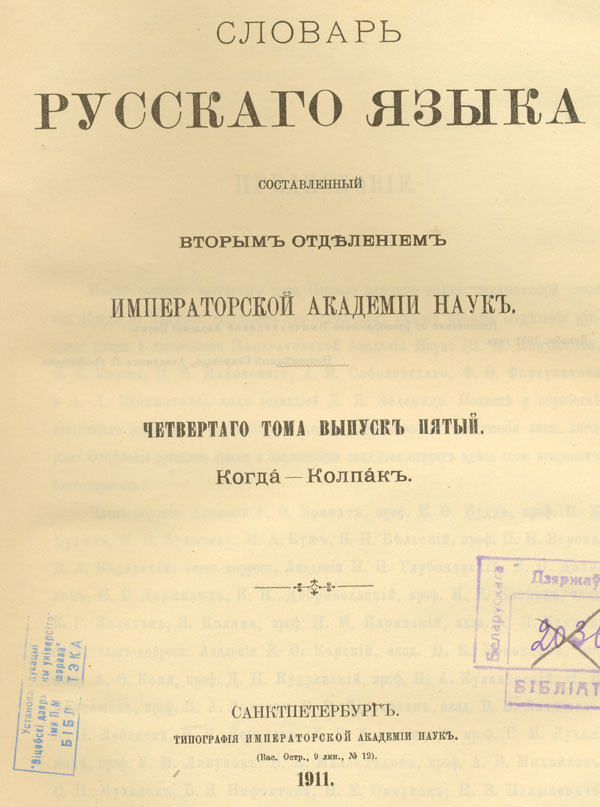 Словарь русскаго языка, составленный Вторым Отделенiем Императорской Академiи Наук.Т. 4, вып. 5 : Когда - Колпак. - Санктпетербург, 1911 ( : Типографiя Императорской Академiи Наук). - VIII с., Стб. 1281-1600.