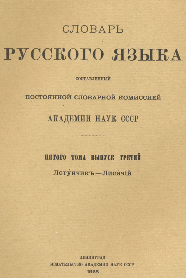 Словарь русского языка. Т. 5, вып. 3 : Летунчик - Лисичій / составленный постоянной Словарной Комиссией АН СССР. - Ленинград : Изд-во АН СССР, 1928. - VIII с., Стб. 481-640.