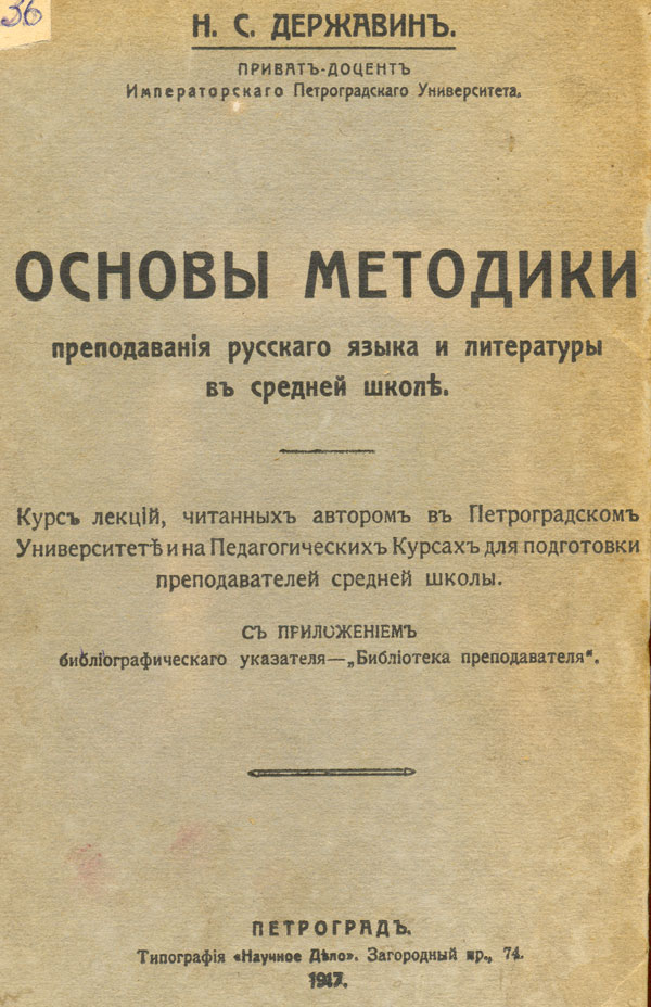 Основы методики преподаванiя русскаго языка и литературы в средней школе : курс лекцiй ... для подготовки преподавателей средней школы : с приложенiем библiографическаго указателя "Библiотека преподавателя" / Н. С. Державин. - Петроград, 1917 ( : Типографiя "Научное Дело"). - VII, 511 с. - Библиогр.: с. 453-510.