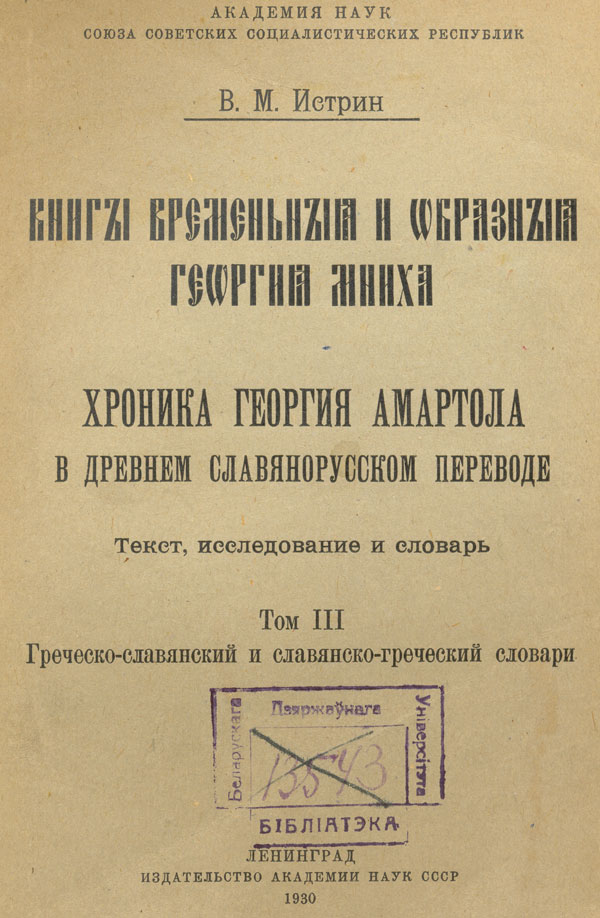 Книгы временьныя и образныя Геогрия Мниха. Хроника Георгия Амартола в древнем славянорусском переводе : текст, исследование и словарь. Т. 3 : Греческо-славянский и славянско-греческий словари / В. М. Истрин ; АН СССР. - Ленинград : Изд-во АН СССР, 1930. - L, 348 с.