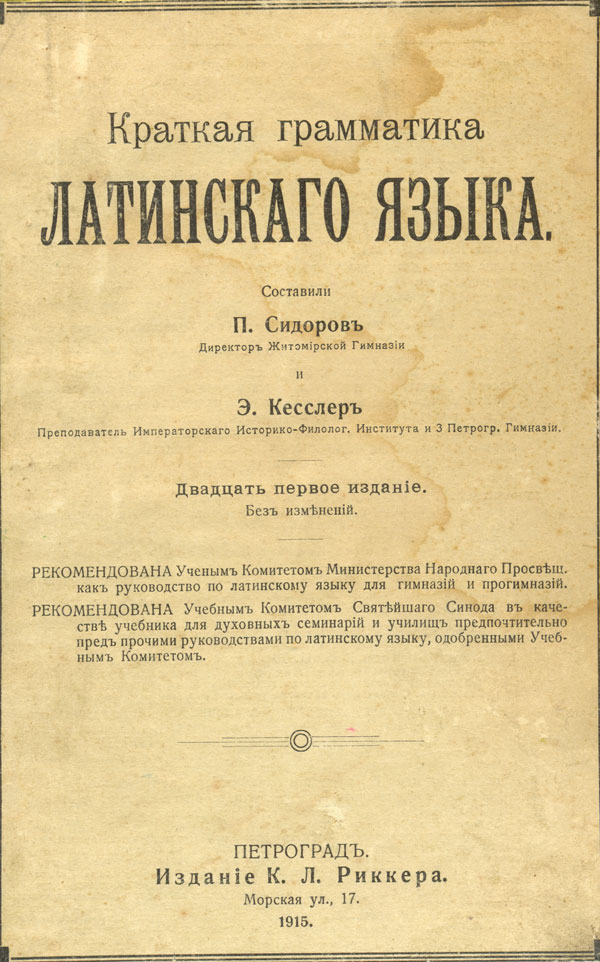 Краткая грамматика латинскаго языка : руководство по латинскому языку для гимназiй и прогимназiй : учебник для духовных семинарiй и училищ предпочтительно пред прочими руководствами по латинскому языку / сост. П. Сидоров, Э. Кесслер . - Двадцать первое изданiе. - Петроград : Изданiе К. Л. Риккера, 1915. - 87, 182 с. - Указ.: с. 175-180.
