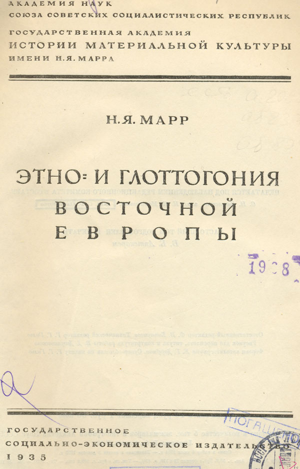 Избранные работы. Т. 5 : Этно= и глоттогония Восточной Европы / Н. Я. Марр ; АН СССР, Гос. академия истории материальной культуры им. Н. Я. Марра. - Москва ; Ленинград : Гос. социально-экономическое изд-во, 1935. - XXI, 668 с., портр. - Библиогр. в обл. ссылок. - Указатели: с. 539-666.