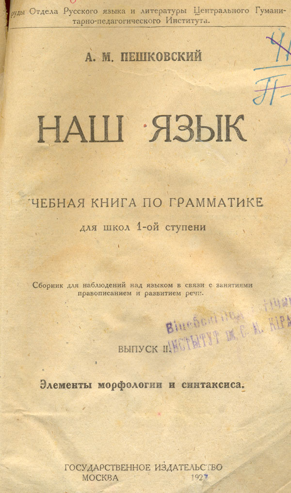 Наш язык : учебная книга по грамматике для школ 1-ой ступени : сборник для наблюдений над языком в связи с занятиями правописанием и развитием речи. Вып. 2 : Элементы морфологии и синтаксиса / А. М. Пешковский. - Москва : Гос. изд.-во, 1923. - 343, VIII c. - (Труды Отдела Русского языка и литературы Центрального Гуманитарно-педагогического Института).