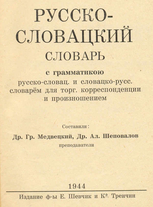 Русско-словацкий словарь : с грамматикою русско-словац. и словацко-русс. словарем для торг. корреспонденции и произношением / сост.: Г. Медвецкий, А. Шеповалов . - Тренчин : Издание ф-ы Е. Шевчик и К., 1944. - 663 с. - Текст парал. рус., словац.
