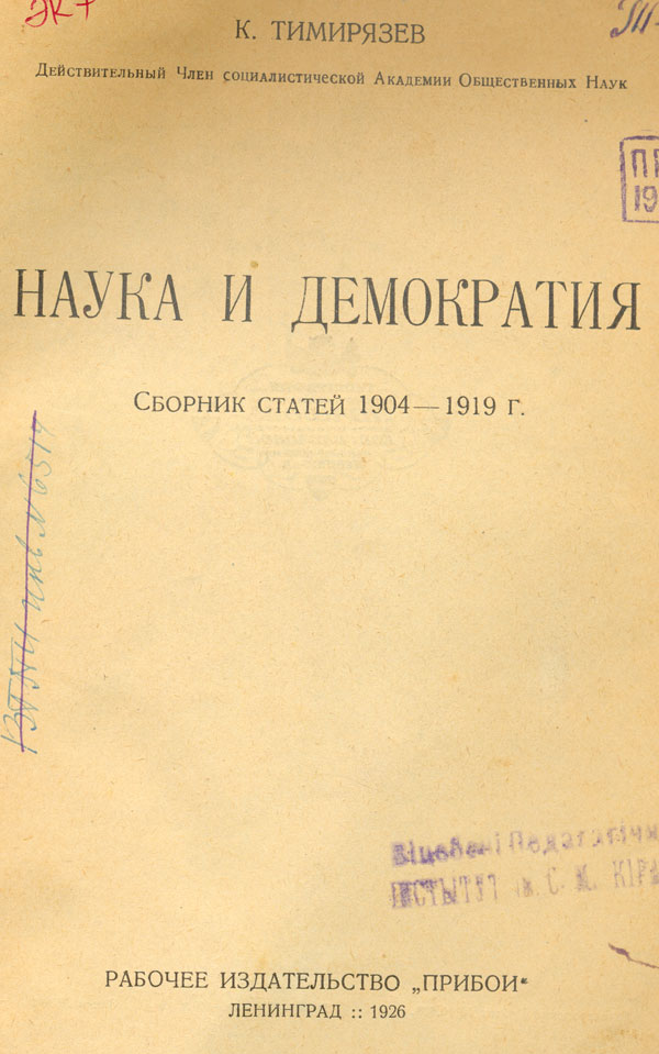 Наука и демократия : сборник статей, 1904-1919 г. / К. Тимирязев. - Ленинград : Прибой, 1926. - XVI, 432 с. : портр., [4] вкл. л. - Библиогр. в обл. ссылок.