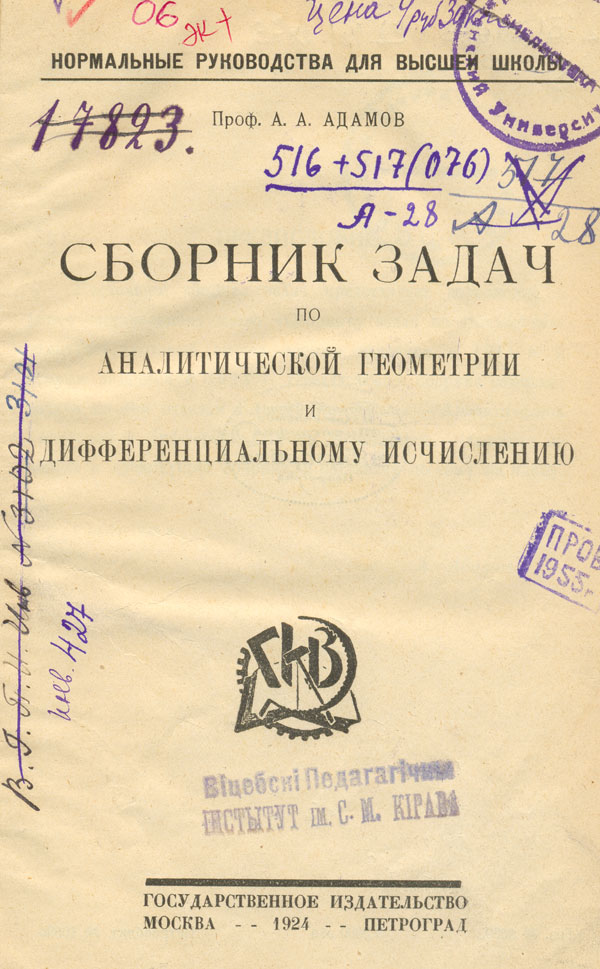 Сборник задач по аналитической геометрии и дифференциальному исчислению / А. А. Адамов. - Москва ; Петроград : Гос. изд.-во, 1924. - 421 с. - (Нормативные руководства для высшей школы).
