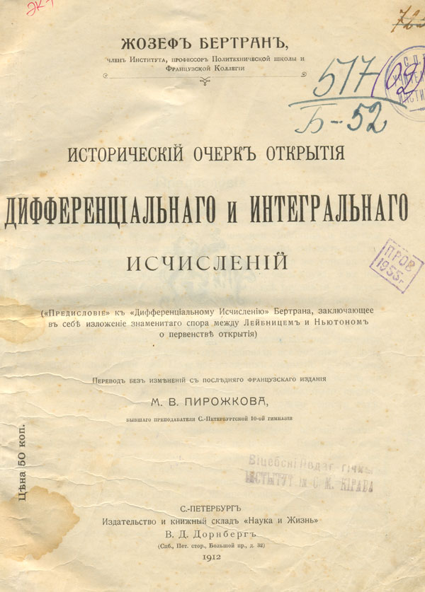 Историческiй очерк открытiя дифференцiальнаго и интегральнаго исчисленiй / Ж. Бертран ; ("Предисловiе"...Ж. Бертрана ; перевод без измененiй с последняго французскаго изданiя М. В. Пирожкова). - С.-Петербург : Издательство и книжный склад "Наука и Жизнь" В.Д. Дорнберг, 1912. - 45, X, 756 с. - Алф.указ.: с. 742-755.