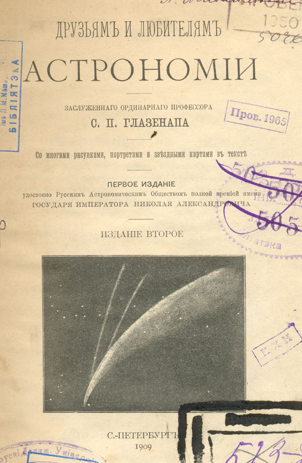 Друзьям и любителям астрономіи : со многими рисунками, портретами и звездными картами в тексте / С. П. Глазенап. - Изданiе второе. - С.-Петербург, 1909 ( : Типографiя А. С. Суворина). - 462 с., [3] вкл. л. - На тит. л.: Первое изданiе удостоено Русским Астрономическим Обществом полной премiей имени Государя Императора Николая Александровича.