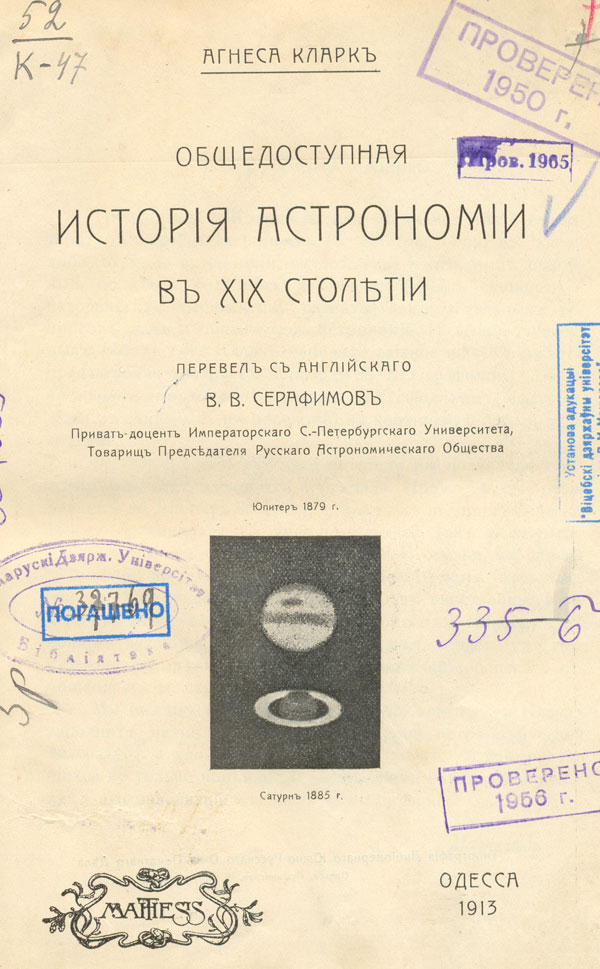Общедоступная исторія астрономіи в XIX столетіи / А. Кларк ; перевел с англiйскаго В. В. Серафимов. - Одесса : MATHESIS, 1913. - 656 c.: ил., [4] вкл. л.