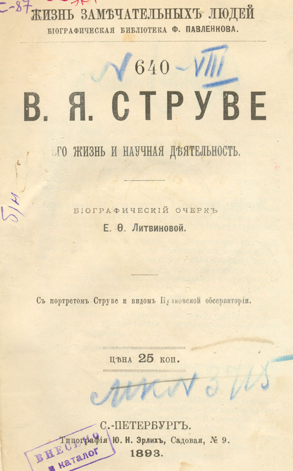 Струве В. Я. Жизнь и научная деятельность : биографический очерк. - С.-Петербургъ, 1893. - 94 с.