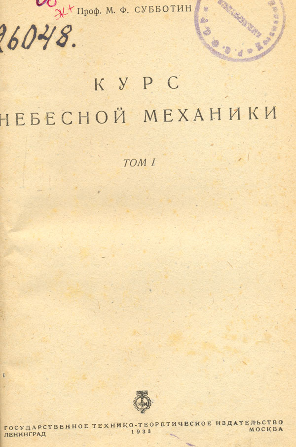 Курс небесной механики. Т. 1 / М. Ф. Субботин. - Ленинград ; Москва : Гос. технико-теоретическое изд-во, 1933. - 320 с. - Библиогр.: с. 316.