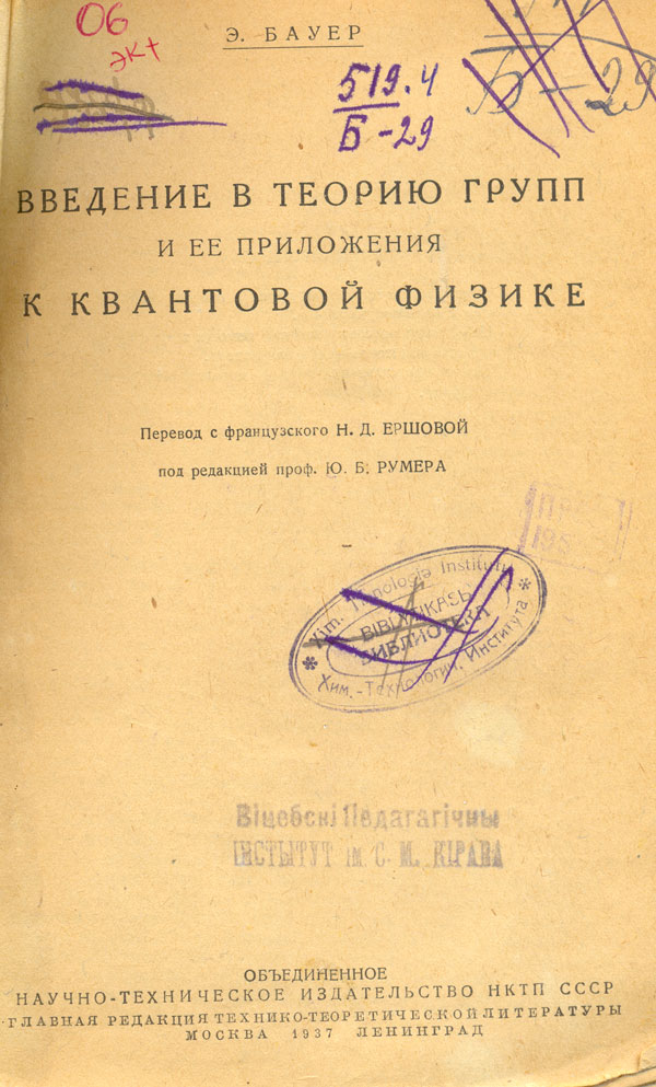 Введение в теорию групп и ее приложения к квантовой физике / Э. Бауер ; пер. с фр. Н. Д. Ершовой ; под ред. Ю. Б. Румера. - Москва ; Ленинград : ОНТИ НКТП СССР, Гл. ред. технико-теоретической лит., 1937. - 154 с. - Библиогр. в обл. ссылок. - Загл. парал. рус., фр.