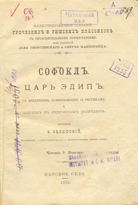 Царь Эдип: с введенiем, примечанiями, 29 рисунками и ключом к лирическим размерам / объснил Ф. Зелинскiй. - Царское Село: [Типо-литографiя В.А. Вацлика], 1892. - 220 с. разд. паг., [8] вкл. л. - (Иллюстрированное собранiе греческих и римских классиков с объяснительными примечанiями / под редакцiей Льва Георгiевскаго и Сергея Манштейна). - Изд. конволют без общ. тит. л., состоящий из двух изданий. - Содерж.: Часть I : Текст. - 80 с., [8] вкл. л. ; Часть II : Комментарiй . - 140 с.