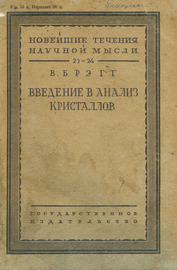 Введение в анализ кристаллов / В. Брэгг ; пер.с англ. И. Г. Василевской ; под ред. Я. И. Френкеля. - Москва ; Ленинград : Гос. Изд-во, 1930. - 224 с. - (Новейшие течения в научной мысли ; 23-24). - Предм. указ.: с. 220-223. - Парал. загл. рус., англ. на обороте тит.л.