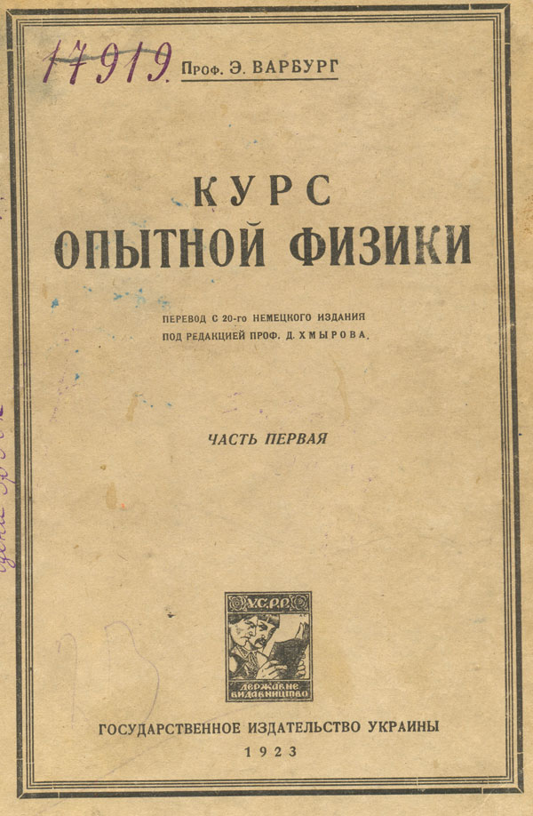 Курс опытной физики : для слушателей вузов. Ч. 1 : Механика твердых и жидких тел. Молекулярная физика. Звук. Теплота / Э. Варбург ; пер. с 20-го нем. изд. под ред. Д. Хмырова. - [Одесса] : Гос. изд-во Украины, 1923. - 272 с. - Библиогр. в обл. ссылок. - Алф. указ.: с. 267-272.