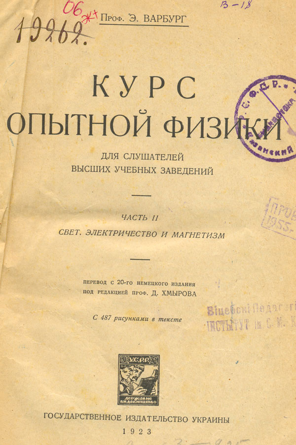 Курс опытной физики : для слушателей высших учебных заведений. Ч. 2 : Свет. Электричество и магнетизм / Э. Варбург ; пер. с 20-го немецкого изд. под ред. Д. Хмырова. - [Одесса] : Гос. изд-во Украины, 1923. - X, 339 с. - Алф. указ.: с. 333-339.