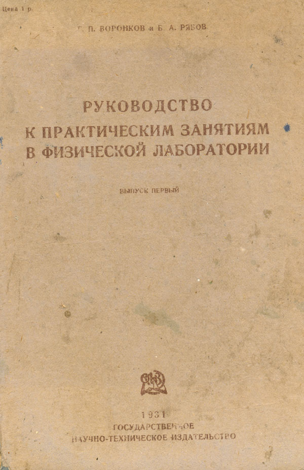 Руководство к практическим занятиям в физической лаборатории : пособие для ВТУЗов. Вып. 1 : Механика, молекулярноя физика и теплота / Г. П. Воронков, Б. А. Рябов ; под. ред. В. Д. Зернова. - Москва ; Ленинград : Гос. научно-техническое изд.-во, 1931. - 120 с. : ил.