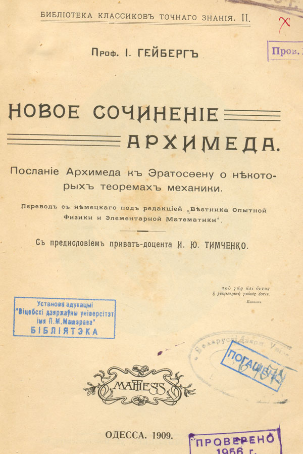 Новое сочиненiе Архимеда. Посланiе Архимеда к Эратосфену о некоторых теоремах механики / І. Гейберг ; перевод с немецкаго под редакцiей "Вестника опытной физики и элементарной математики" ; с предисловiем ...И. Ю. Тимченко. - Одесса : MATHESIS, 1909. - XV, 32 с., портр. - (Библiотека классиков точнаго знанiя. [Вып.] ІІ). - Библiогр. в обл. ссылок.