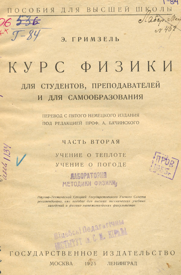 Курс физики для студентов, преподавателей для самообразования : пособие для втузов и физ.-мат. фак-тов. Ч. 2 : Учение о теплоте. Учение о погоде / Э. Гримзель ; пер. с 5-го нем. изд. под ред. А. Бачинского. - Москва ; Ленинград : Гос. изд-во, 1925. - 276 с. : ил., [1] вкл. карт. - (Пособия для высшей школы).