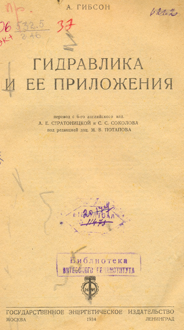 Гидравлика и ее приложения / А. Гибсон ; пер. с 6-го англ. изд. А. Е. Стратоницкой и С. С. Соколова ; под ред. М. В. Потапова. - Москва ; Ленинград : Гос. энергетическое изд-во, 1934. - 610 с. : ил. - Указ.: с. 606-610.
