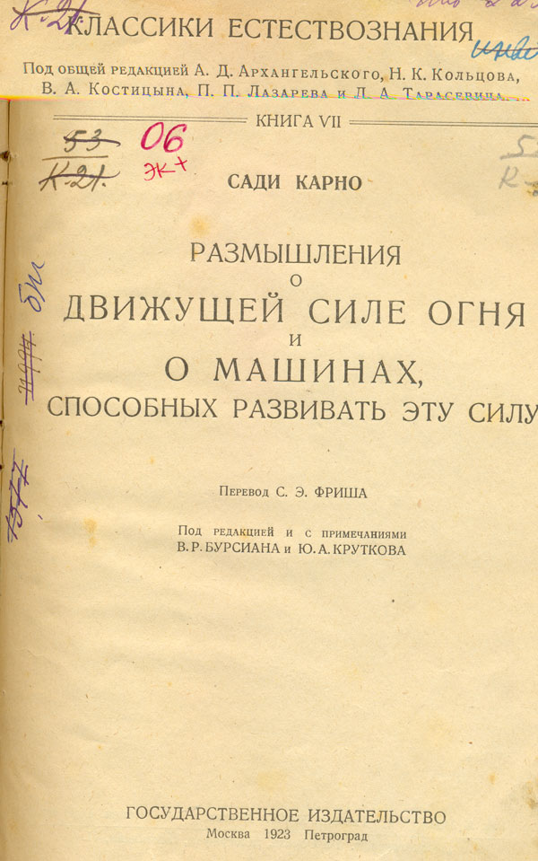 Размышления о движущей силе огня и о машинах, способных развивать эту силу / С. Карно ; пер. С. Э. Фриша ; под ред. и с примеч. В. Р. Бурсиана и Ю. А. Круткова. - Москва ; Петроград : Гос. изд-во, 1923. - 75 с. : портр., [3] вкл. л. - (Классики естествознания / под общ. ред. А. Д. Архангельского, Н. К. Кольцова, В. А. Костицына [и др.] ; кн. VII). - Загл. парал. рус., фр.