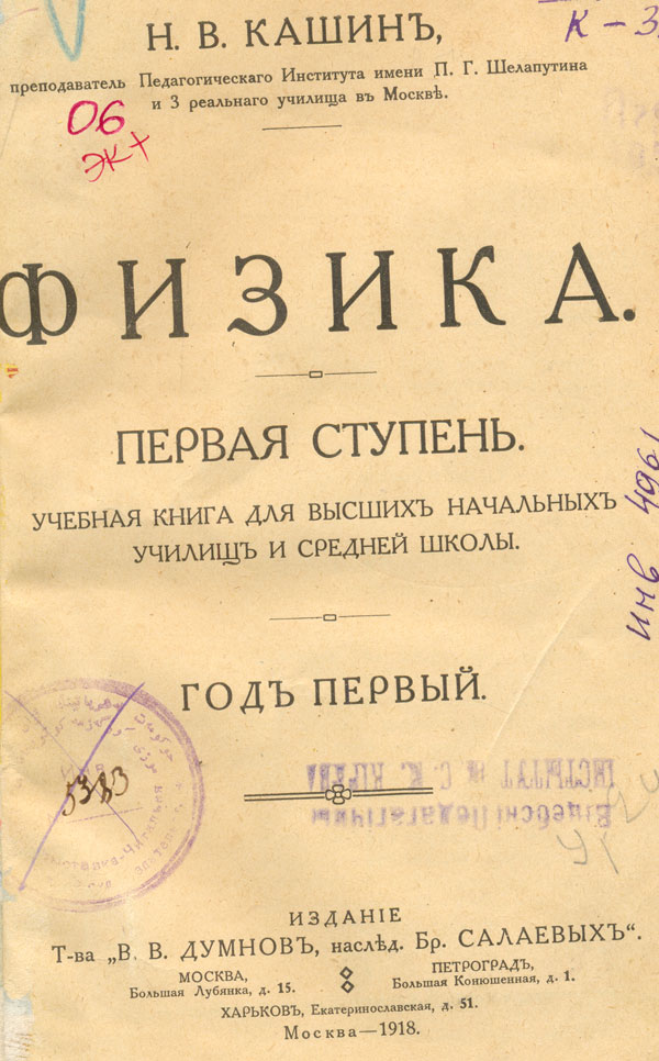 Физика. Первая ступень. Год первый : учеб. книга для высших начальных училищ и средней школы / Н. В. Кашин. - Москва ; Петроград ; Харьков : Изданiе Т-ва "В. В. Думнов, наслед. Бр. Салаевых", 1918. - 237 с. : ил. - Библиогр. в обл. ссылок. - Экз. деф.: нет с. 48-64, 209-224.
