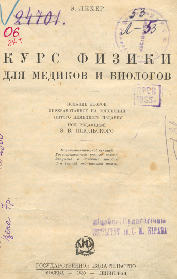 Курс физики для медиков и биологов : пособие для высшей медицинской школы / Э. Лехер ; под ред. Э. В. Шпольского. - Изд. 2-е, перераб. на основании 5-го нем. изд. - Москва ; Ленинград : Гос. изд-во, 1930. - 568 с. - Алф. указ.: с. 559-568. - Загл. парал. рус., нем. на обороте тит. л.