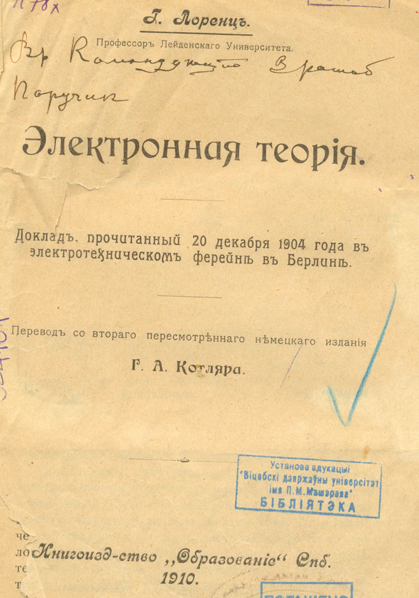 Электронная теорiя : доклад, прочитанный 20 декабря 1904 года в электротехническом ферейне в Берлине / Г. Лоренц ; перевод со втораго пересмотреннаго немецкаго изданiя Г. А. Котляра. - Спб. : Книгоиздательство "Образованіе", 1910. - 64 с. - Экз. деф.: нет посл. с.