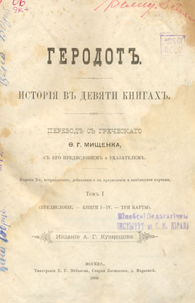 Исторiя в девяти книгах / перевод с греческаго Ф.Г. Мищенка, с предисловiем и указателем. - Изданiе 2-е, исправленное, добавленное в предисловiи и снабженное картами. - Москва: Изданiе А.Г. Кузнецова : Типографiя Е.Г. Потапова, 1888. - CLXIX, 396 с., LXX, 643 с. разд. паг. - Изд.конволют без общ. тит., состоящий из двух отдельно изданных томов. - Содерж.: Т. 1 : Предисловiе. Книги I-IV. - CLXIX, 396 с., 3 карты ; Т. 2 : Предисловiе. Книги V-IX. - LXX, 643 с., 2 карты. - Указатель имен и предметов с примеч.: с. 381-639.
