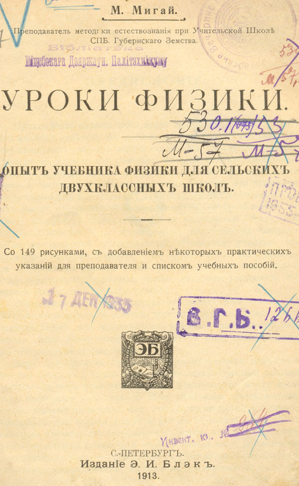 Уроки физики : опыт учебника физики для сельских двухклассных школ / М. Мигай. - С.-Петербург : Изданiе Э. И. Блэк, 1913. - 163, VIII c. : ил.