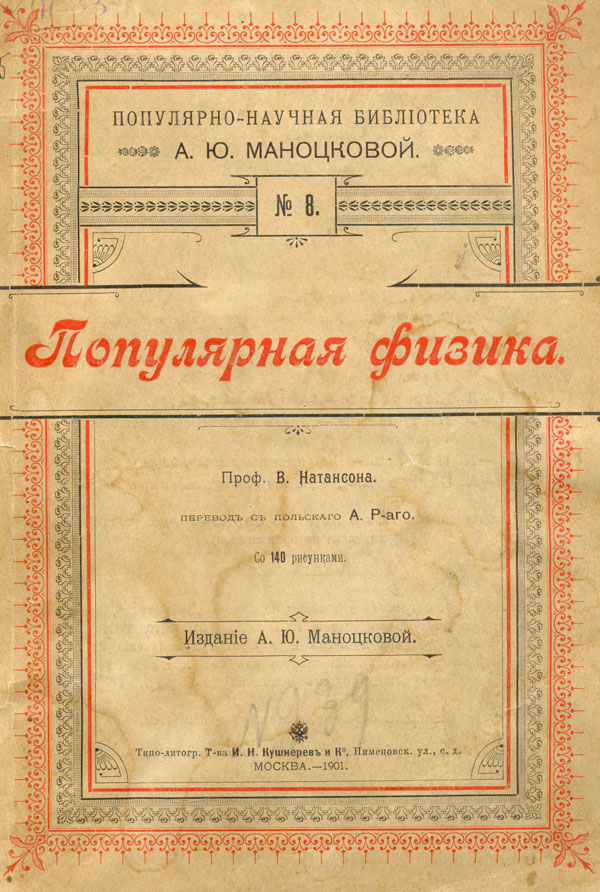 Популярная физика : [пер. с пол.] / В. Натансон. - С.-Петербург : [Типо-литогр. Т-ва И. Н. Кушнерев и К.] : Изданiе А. Ю. Маноцковой, 1901. - 170 с. : ил. - (Популярно-научная библiотека А. Ю. Маноцковой ; N 8-й). - Предм. указ.: с. 169-170. - Ярлык библiотеки проф. А. Н. Волкова на с. III. - Экз. деф.: нет с. 95-96.
