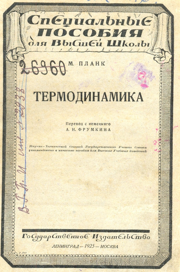 Термодинамика : пособие для вузов / М. Планк ; пер. с нем. А. Н. Фрумкина. - Ленинград ; Москва : Гос. изд-во, 1925. - 311 с. - (Специальные пособия для высшей школы).