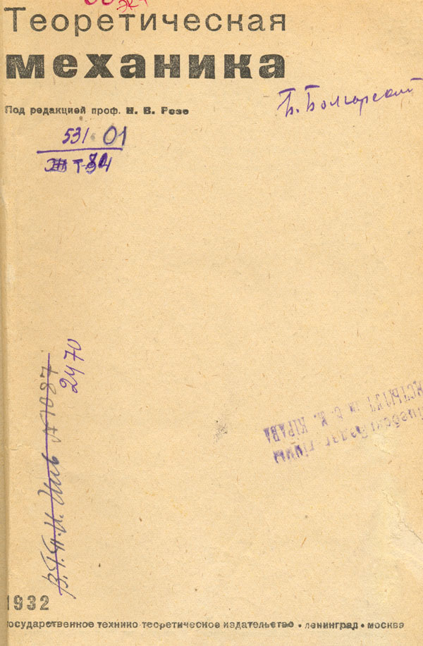 Теоретическая механика. Ч. I : [Механика материальной точки] / под ред. Н. В. Розе . - Ленинград ; Москва : Гос. технико-теорет. изд-во, 1932. - 372 с. : [1] вкл. л. - Библиогр. в конце глав.